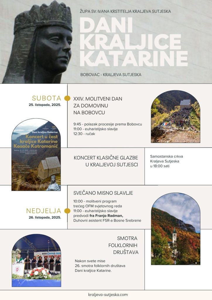 Sljedeće nedjelje u našoj župi je proslava Dana kraljice Katarine, kao i XVI. Nacionalno hodočašće Trećeg Franjevačkog svjetovnog reda BiH. Sat vremena prije mise Nacionalno vijeće OFS-a za BiH pripremilo je prigodan program, pa Vas pozivamo da sudjelujete u tom programu. Svetu misu u 11 sati predvodit će fra Franjo Radman, Duhovni asistent FSR-a Bosne Srebrene.
